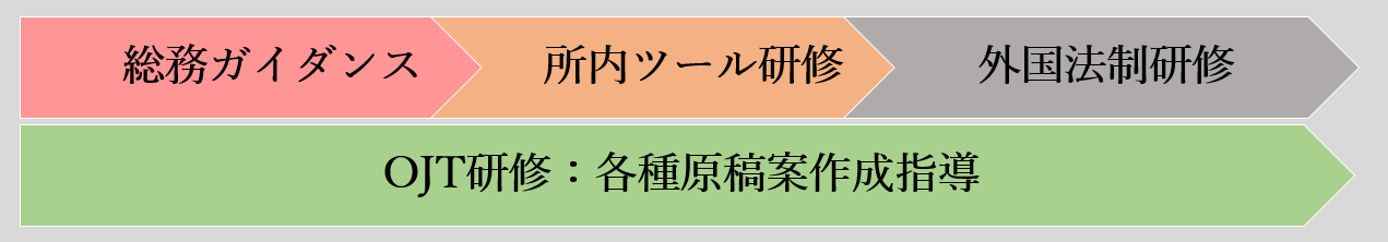 知財業務未経験者には、上記研修に加えて、特許全般の基礎知識習得から徐々に実務に近づいていくよう配慮された講義や演習を行い、スムーズに業務を理解できるよう指導を行います。