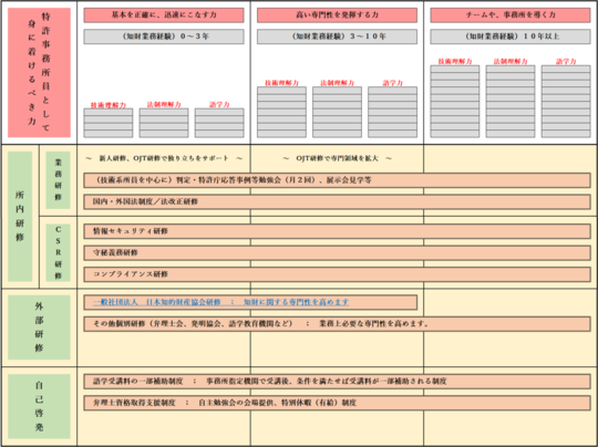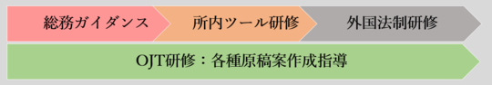 自部署の所内での位置付けや役割、所内における中心的な業務フローや提供サービス、お客様情報、守秘義務等、当所の所員が最初に知っておくべき事柄を学びます。